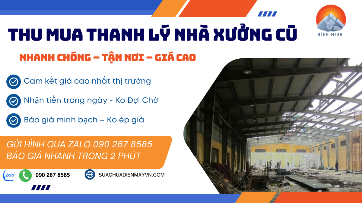 Bình Minh chuyên Thu Mua & Thanh Lý Nhà Xưởng: thu mua giá cao, thanh lý nhanh, báo giá Zalo trong 2 phút, 0 đồng tháo dỡ – bốc xếp – vận chuyển, gọn sạch – an toàn – đúng quy định an toàn lao động & PCCC.