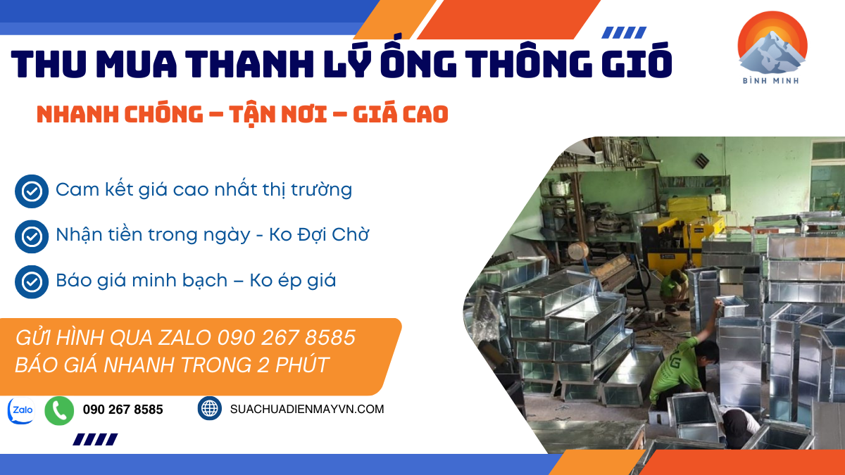Bình Minh chuyên Thu Mua & Thanh Lý Ống Thông Gió: thu mua giá cao, thanh lý nhanh, báo giá Zalo chỉ 2 phút, không mặc cả nếu đúng ảnh/mô tả. 0 đồng tháo dỡ – bọc – vận chuyển, gọn sạch – an toàn (che phủ thang máy – sàn tường, không ảnh hưởng hoạt động tòa nhà).